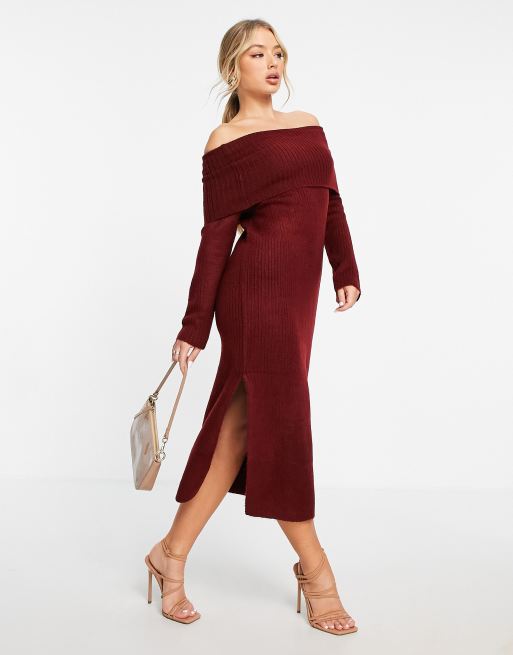 Asos Design Knitted Midi Dress With Off Shoulder In Dark Red Asos